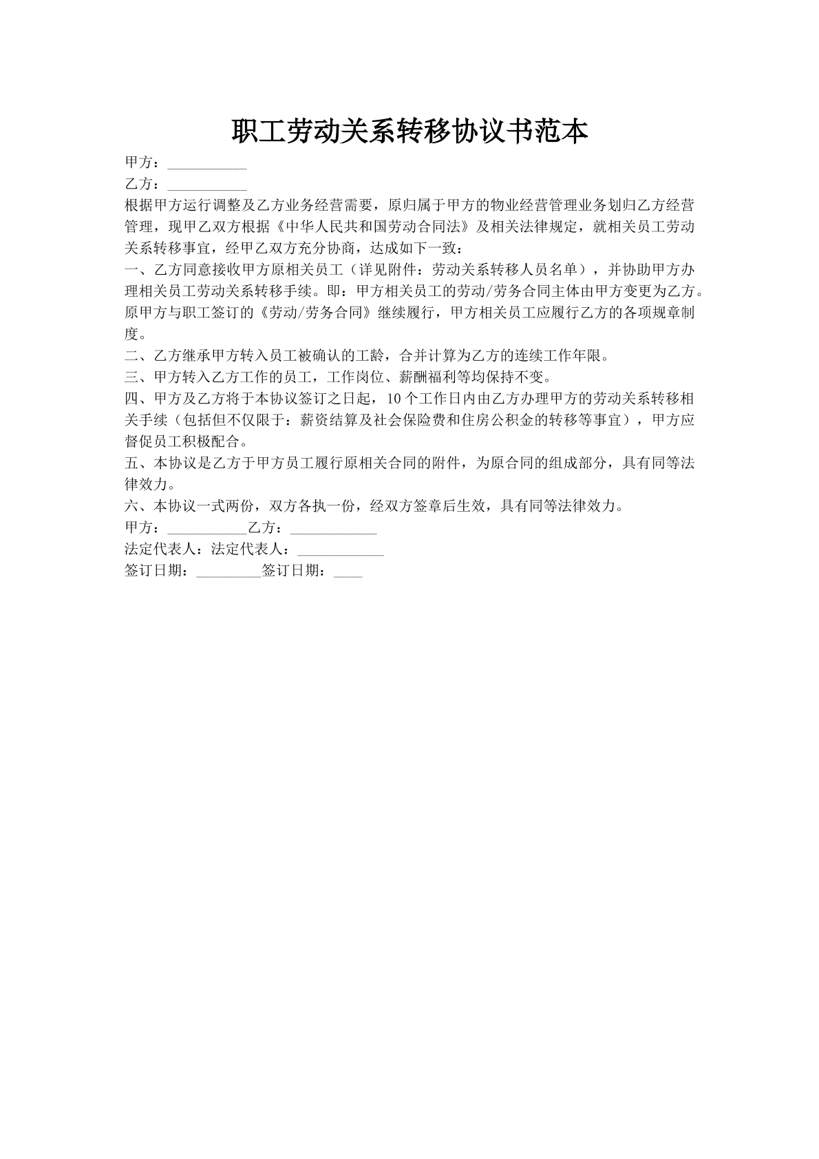 职工劳动关系转移协议书范本