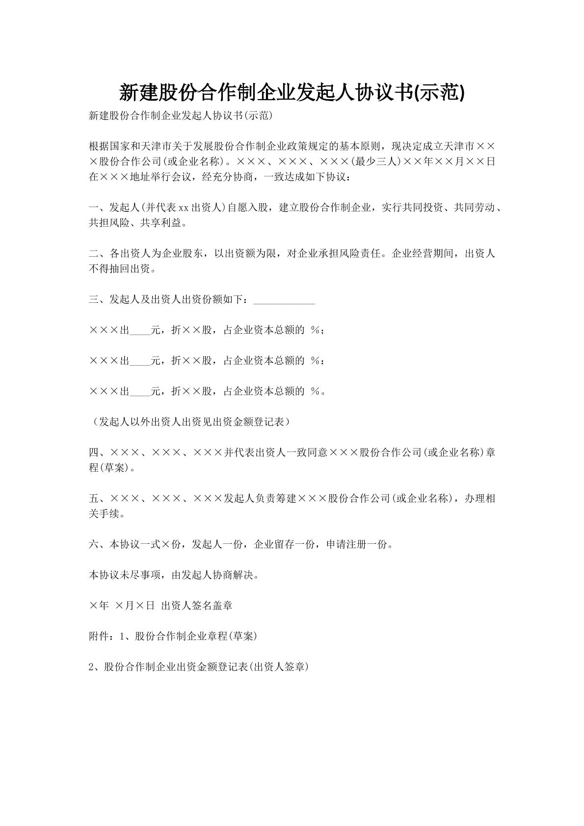 新建股份合作制企业发起人协议书(示范)