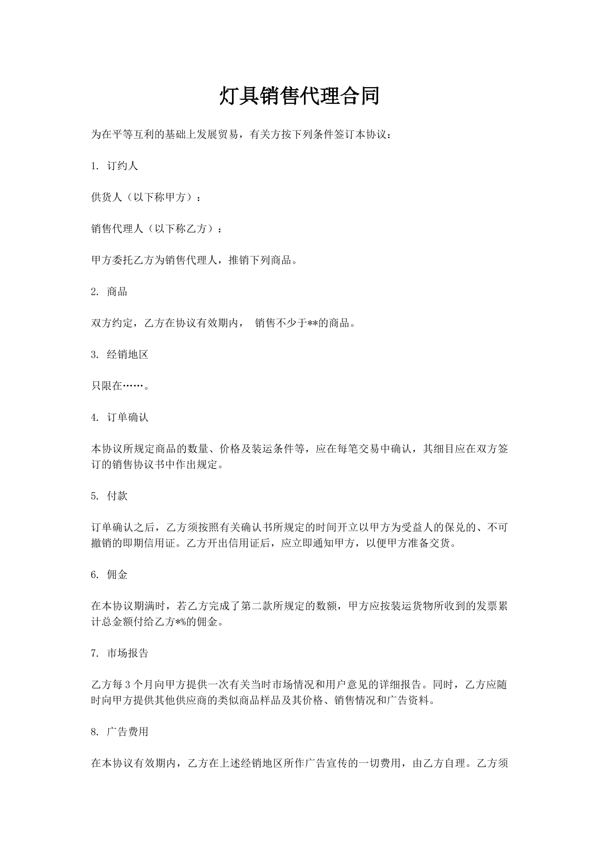 灯具销售代理合同