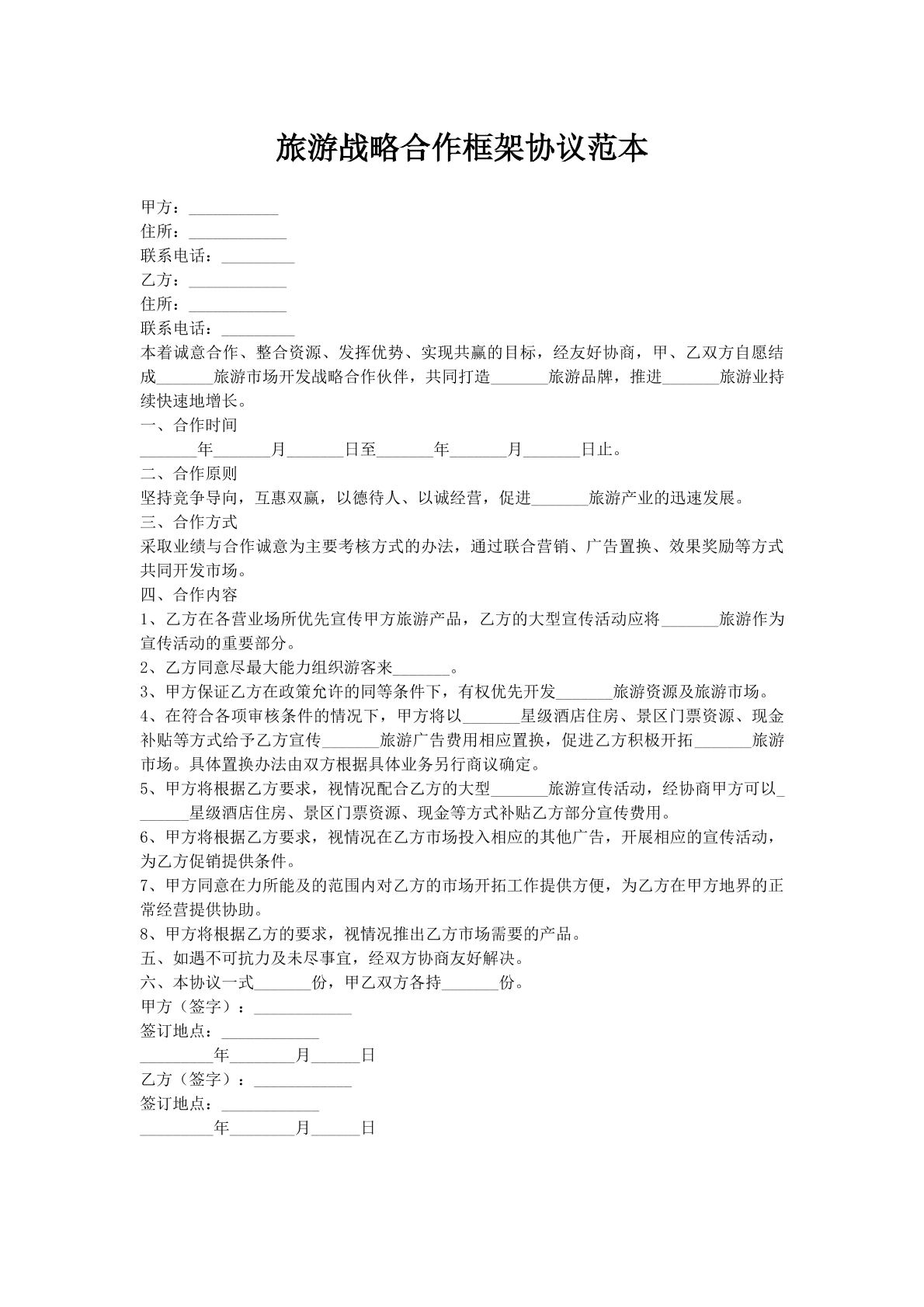 旅游战略合作框架协议范本